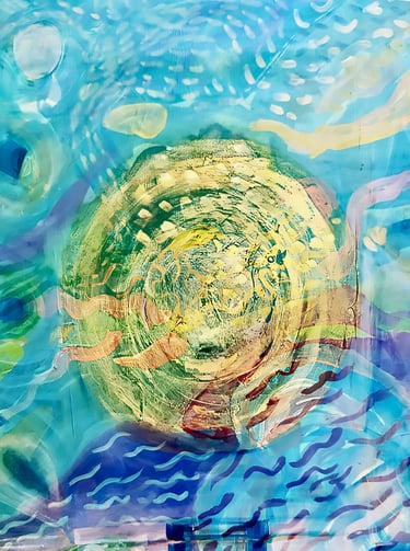 Lush oil paintings blend layers of color into light and shadow, evoking a serene space where time feels irrelevant. Work inspired by Maria's visual language of ancient symbols, meditative states and a love of water.