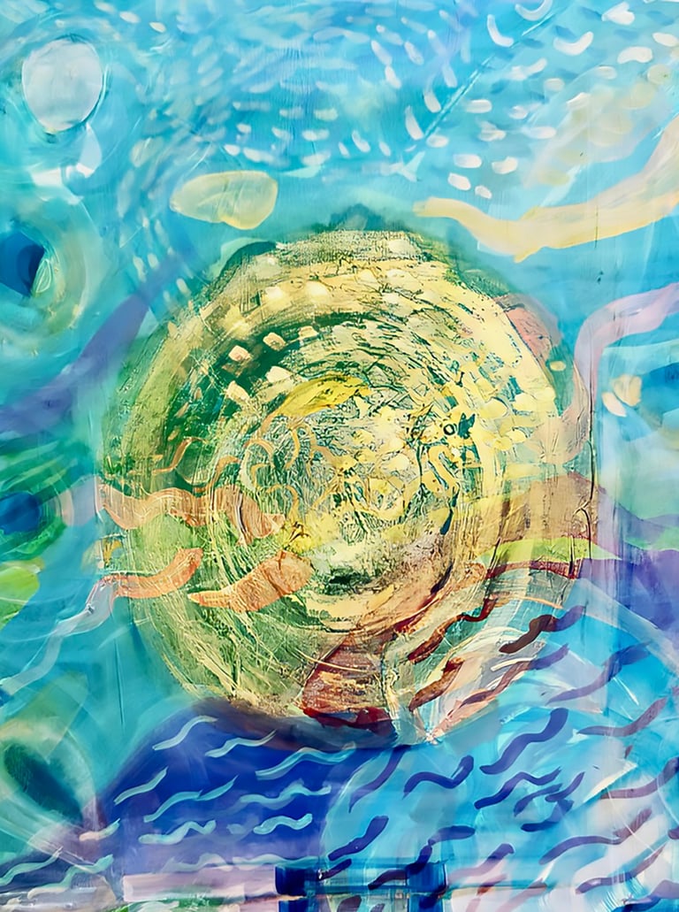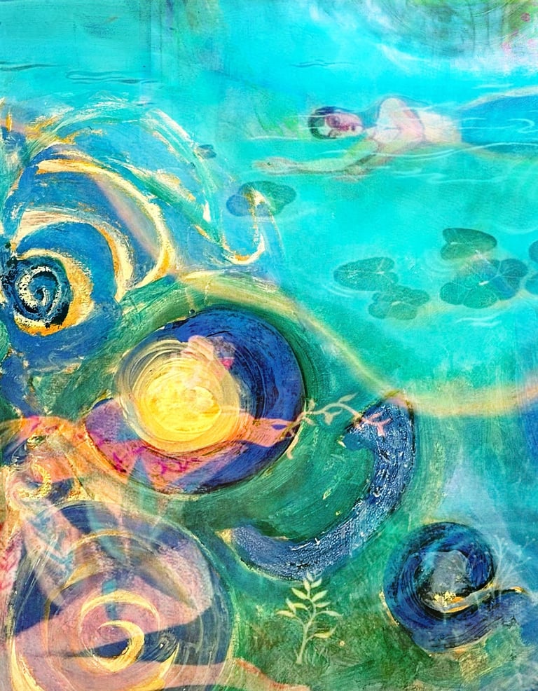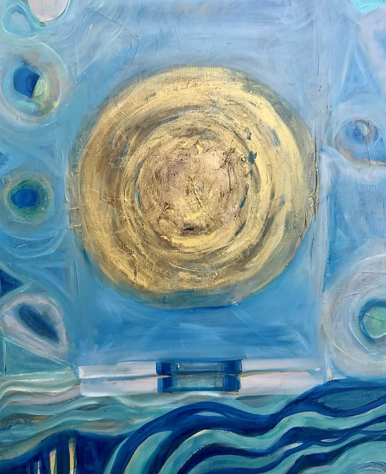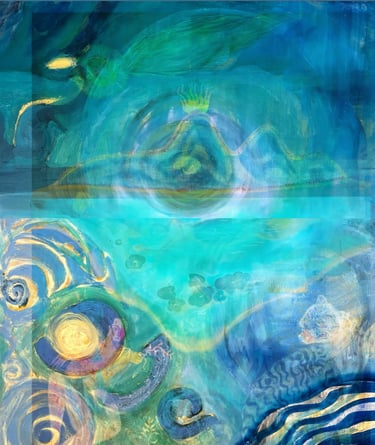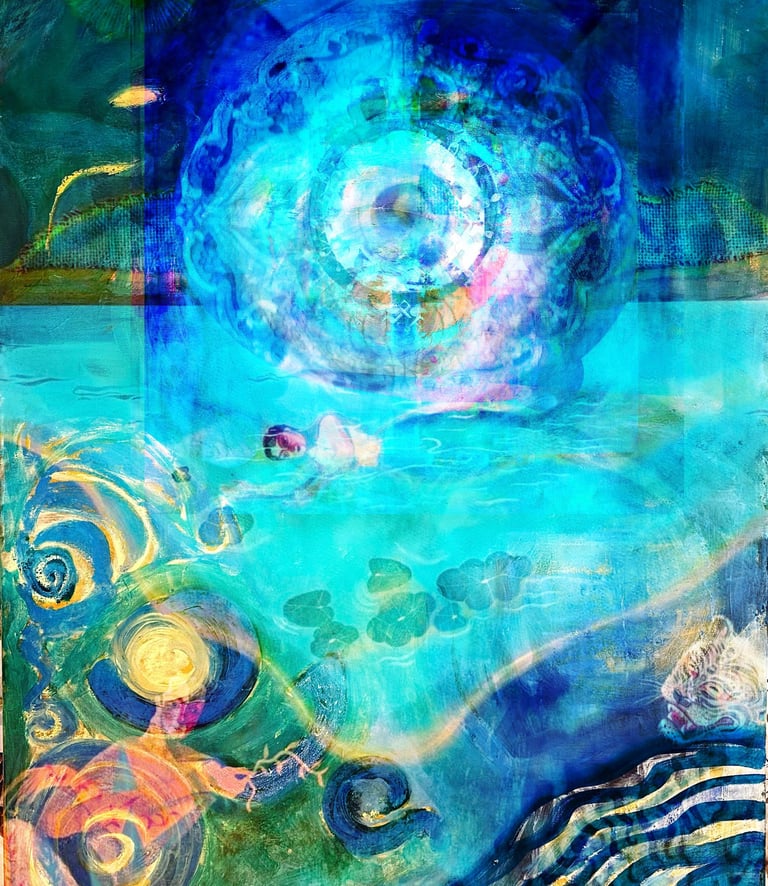 Lush oil paintings blend layers of color into light and shadow, evoking a serene space where time feels irrelevant. Work inspired by Maria's visual language of ancient symbols, meditative states and a love of water.
